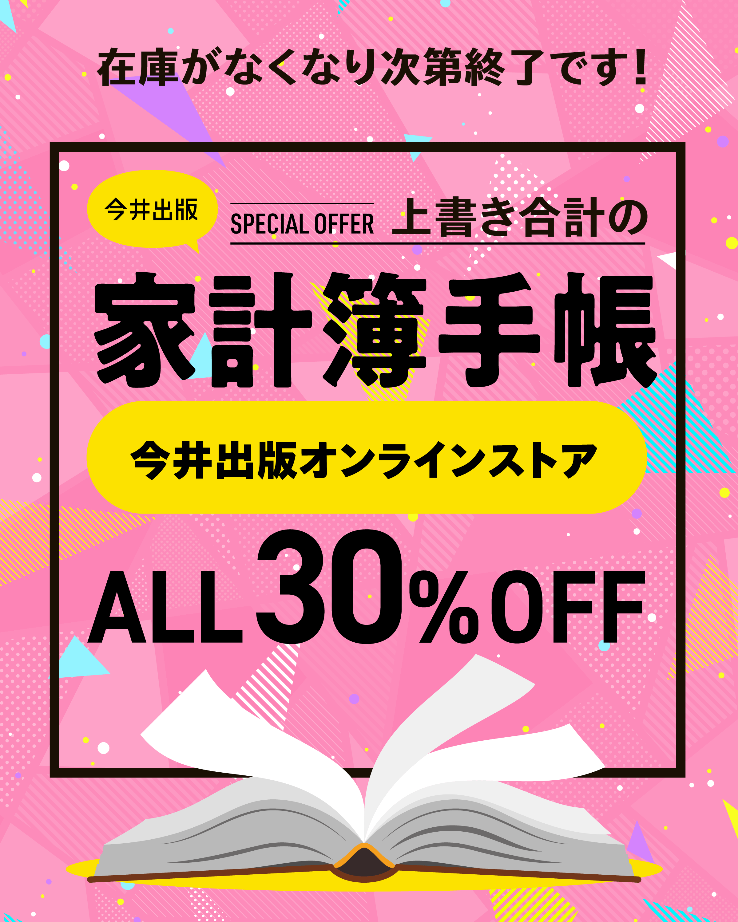 NEW! 今井出版オンラインストアで、手帳SALEが開催中! 大人気の「上書き合計の家計簿手帳」もラインナップに加わりました!【30%OFF】 ※在庫がなくなり次第終了となります。 更新日:2026年2月20日