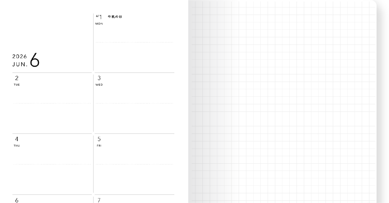 シンプルで使いやすいマンスリーカレンダー(月曜始まり)に加え、ウィークリーカレンダーは週間の予定とメモがしっかり書き込める週間レフトタイプを採用しました。6月1日の「牛乳の日」も忘れないでくださいね。