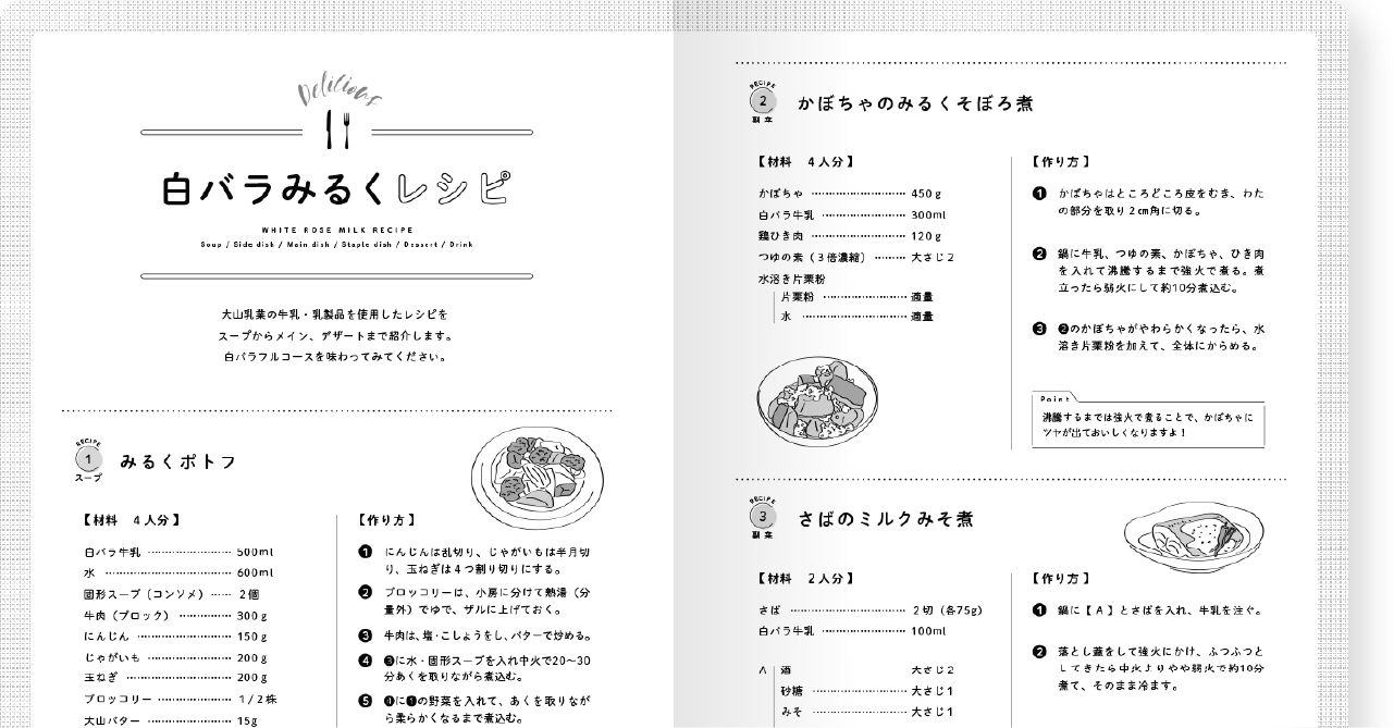 スープからメイン、デザートまで、大山乳業の牛乳や乳製品を使ったレシピを紹介しています!今夜は白バラフルコースにしてみませんか。